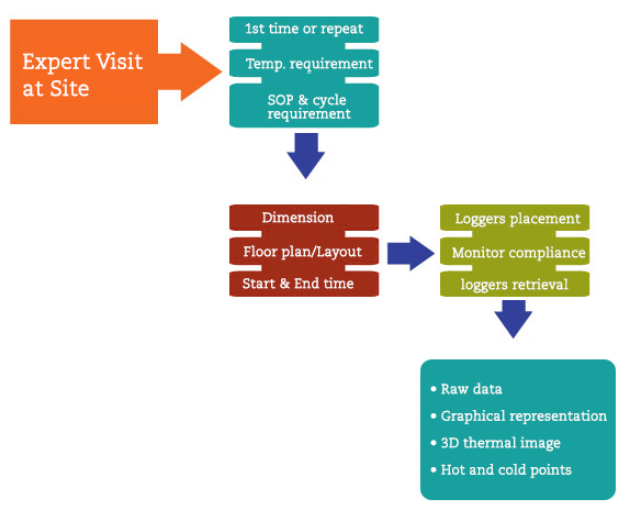 We provide consulting and also help in arriving at the correct mapping of storage of any shape and size. Based on the floor plan of your facility with desired inputs on size and layout, our experienced thermal mapping specialists determine the location and number of measuring points. We place the loggers at the desired locations and activate them. After the specific cycle is over we collect them and provide with you an easy to understand thermal mapping report with a summary and a detailed location based hot and cold points.